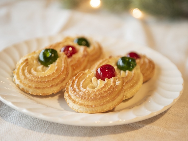 Spijskoekjes, gedecoreerd met een rode of groene bigareaux